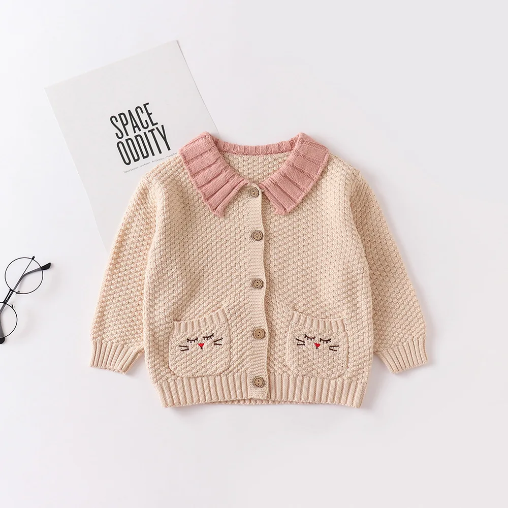 2025 herbst Neue Mädchen Baby drehen-unten Kragen Gestickte Tasche Gestrickte Jacke Nette Vielseitige Outdoor Langarm Strickjacke