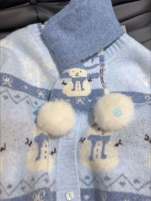 Blauer Schneemann-Strickpullover für Mädchen, Herbst-Winter Fair Isle Lazy Style Cardigan, Weiche Mittlere Strickstärke, Rundhals Langarm-Pullover