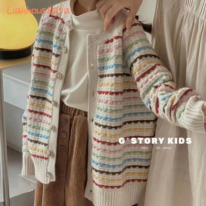 2026 Neuer Koreanischer Stil Mädchen Bunter Gestreifter Strickpullover Herbst Winter Kinder Strickjacke Modische Oberteile für Teenager