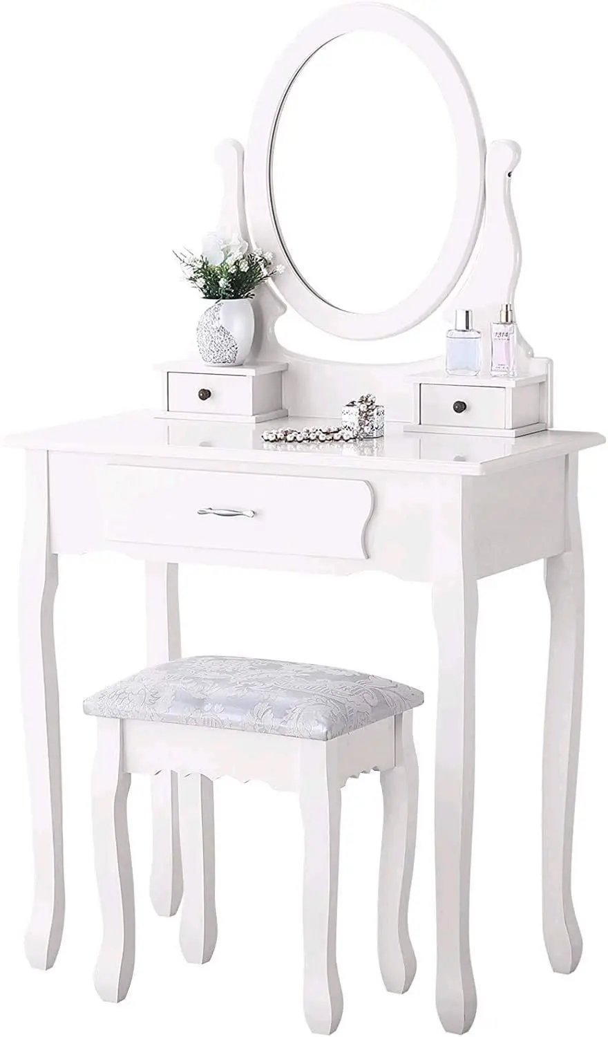 Weißer Schminktisch, Abmessungen: 75 x 40 x 136 cm, mit drehbarem Spiegel, Hocker und 3 Schubladen, geeignet für Schlafzimmer