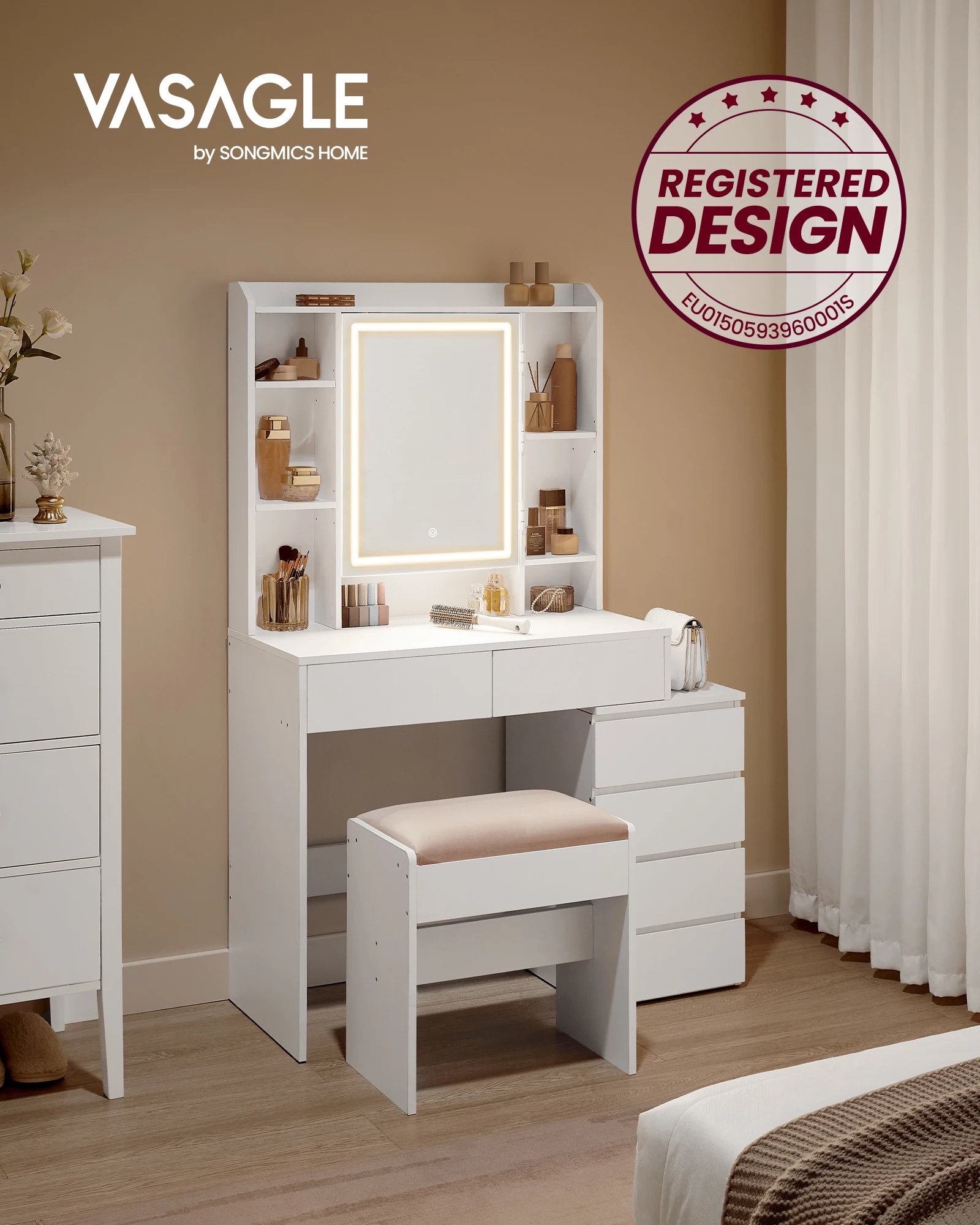 VASAGLE Schminktisch mit LED-Beleuchtung, einstellbare Helligkeit, Frisiertisch mit Spiegel, Kosmetiktisch mit Schubladen
