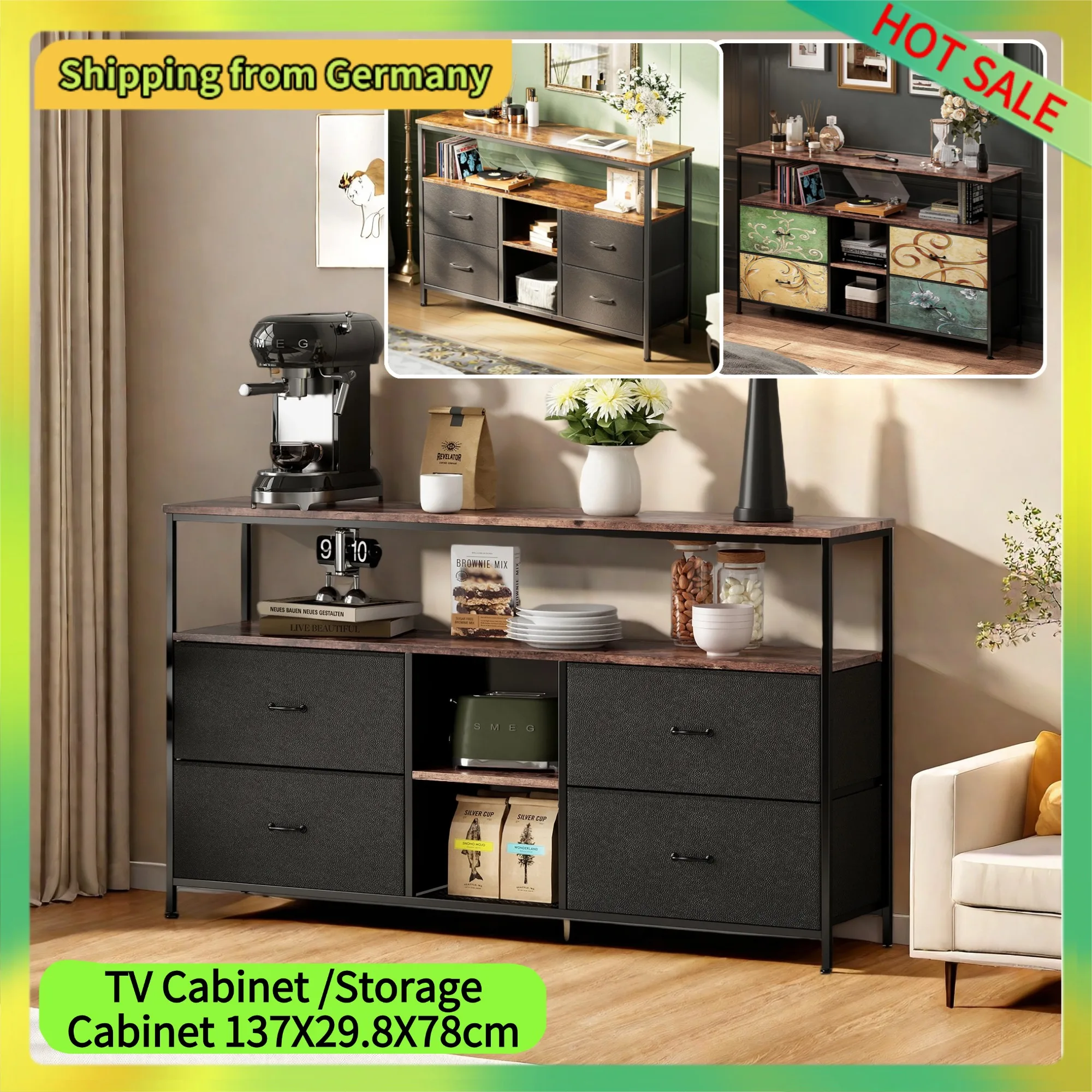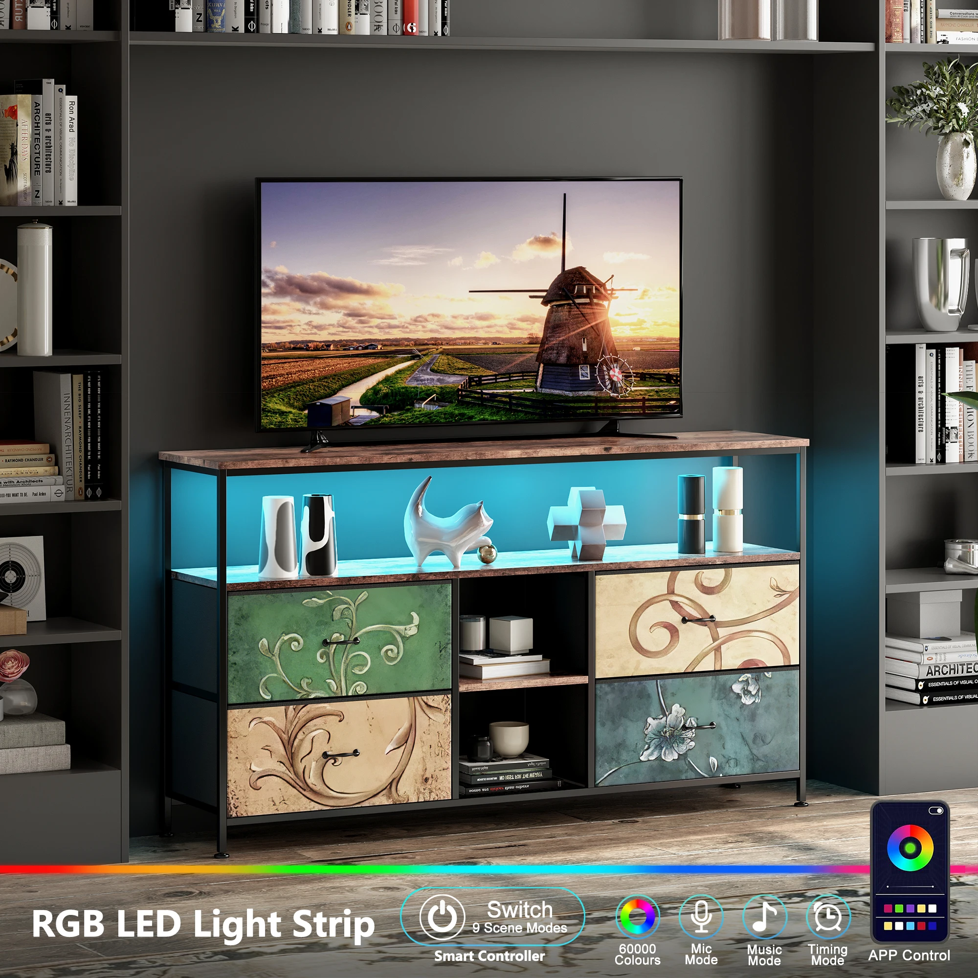 Comanlai 137 x 29,8 x 78 cm TV-Schrank, mit LED-Beleuchtung und 4 Stoffschubladen, Metallrahmen und Holzplatte, für Wohnzimmer, Schlafzimmer