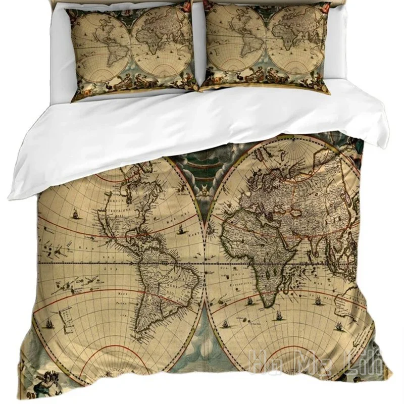 Vintage-Bettbezug, datierte alte Weltkarte, historisches Geographie-Thema, antikes Grungy-Design, bedruckt, dekoratives Bettwäsche-Set