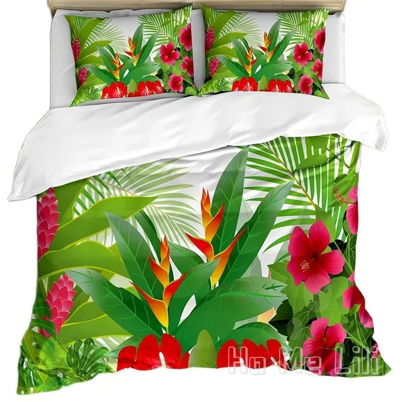 Blatt-Bettbezug von Ho Me Lili, tropischer exotischer Wald, Hibiskus, roter Ingwer, Anthurium, Blumen, Bettwäsche-Set mit Kissenbezügen