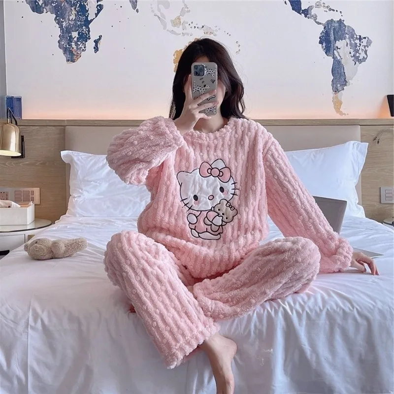 Cartoon Coral Fleece Flanell Kuromi Cinnamoroll Pyjama Loungewear Set Damen Winter Herbst Heim Hello Kitty Dicke Nachtwäsche Niedlich