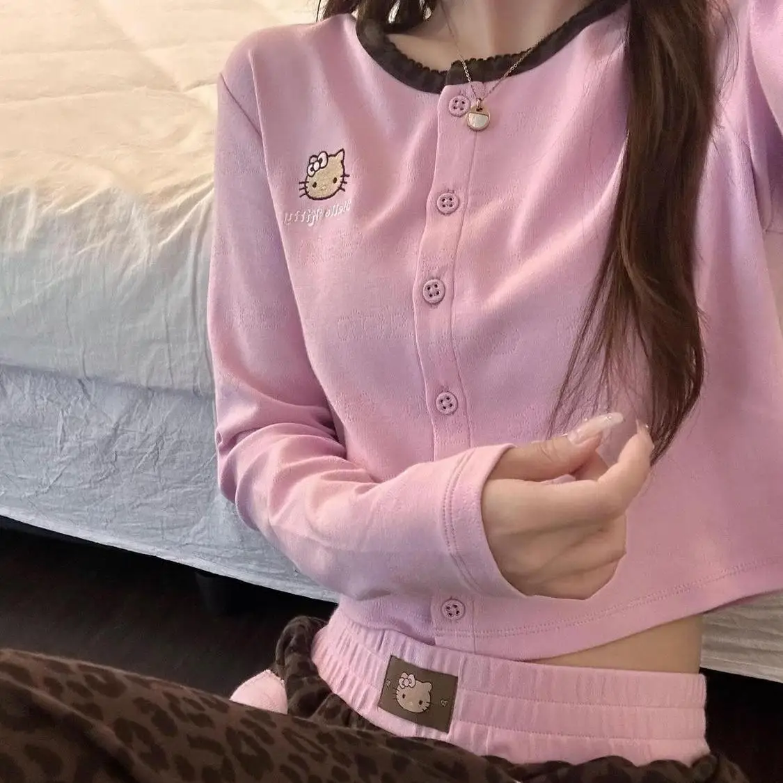 Neues Sanrio Hello Kitty Pyjama-Set, gestrickte Schlafkleidung, weiche und bequeme Homewear, niedlicher Kt-Druck, modischer Anzug, niedliche Anime-Frau