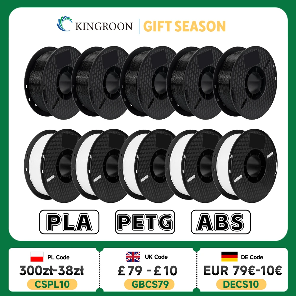 KINGROON 10 kg PLA/ABS/ PETG-Filament 1,75 mm Schwarz Weiß Grau, Großhandel 10 Rollen PLA ABS PETG Kunststoff für 3D-Drucker
