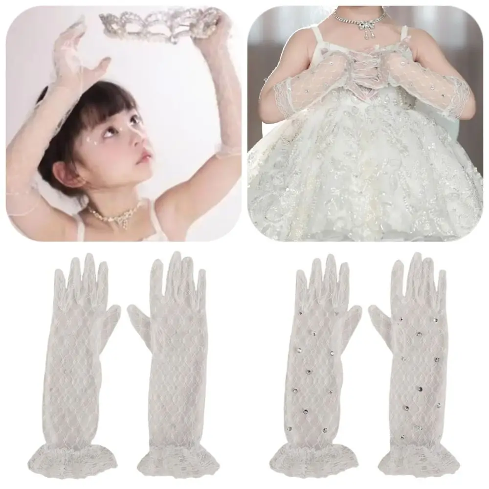 2 Paar weiße Kinder-Spitzenhandschuhe mit fünf Fingern, helle Strass-Blumenmädchen-Fäustlinge, dünne Mesh-Performance-Handschuhe