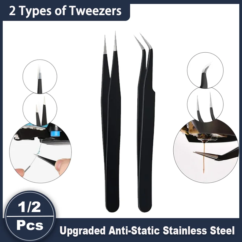 1/2 Stück Antistatische Edelstahlpinzette Set, Gerade & Gebogene Spitze, Präzisionswerkzeuge für 3D-Drucker und Elektronik