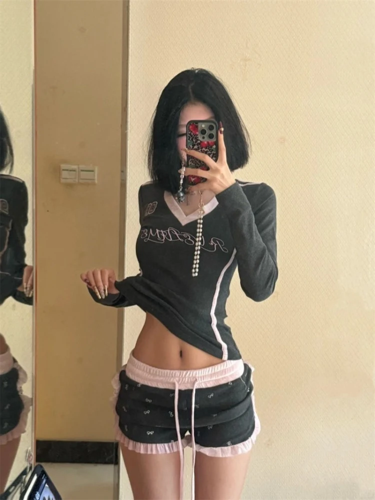 Amrican Vintage Anzüge Frauen Casual Y2k Langarm T-shirts + Kurze Hosen Koreanische Mode 2-teilige Sets Outwear Retro Chic