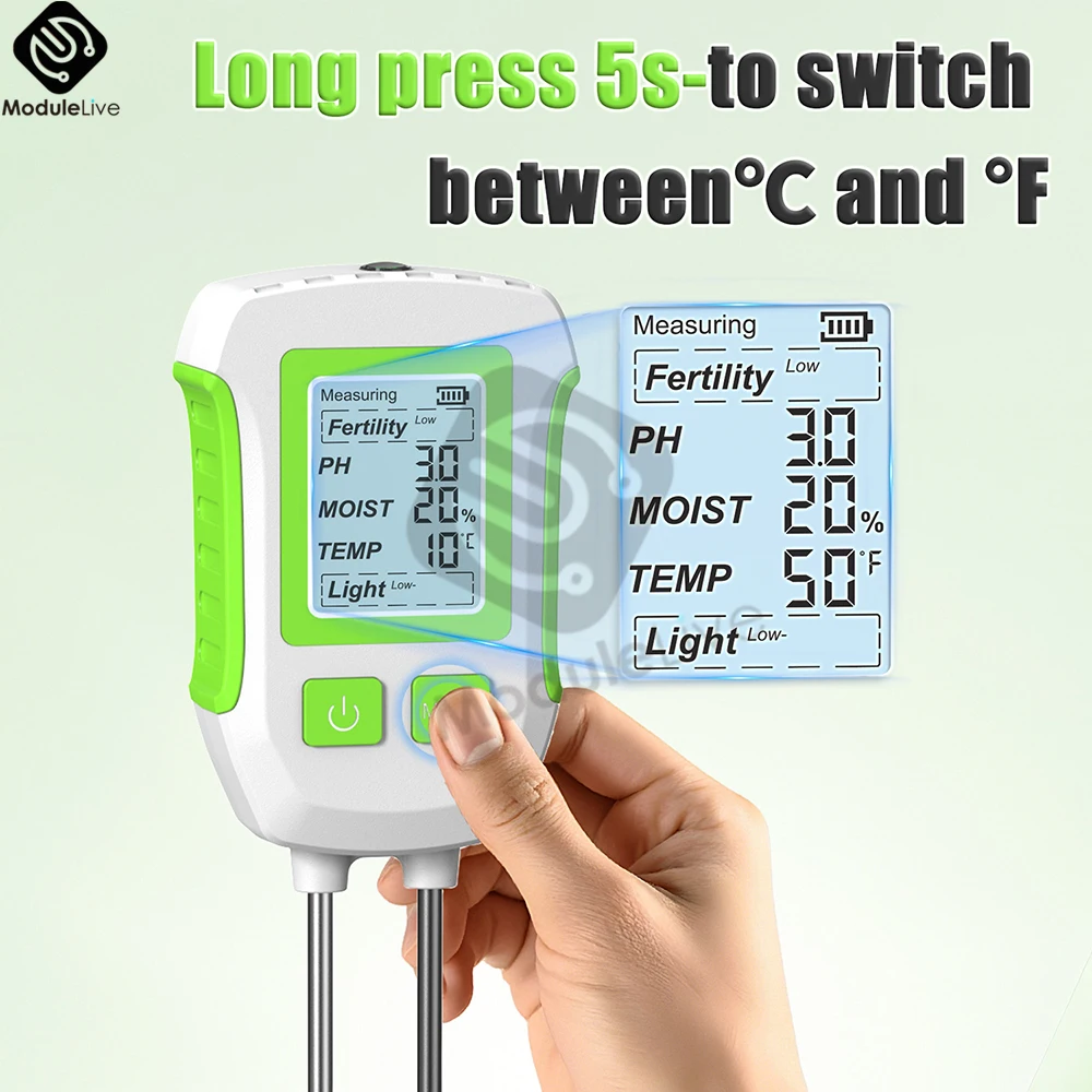 5-in-1-Bodentester PH/Feuchtigkeit/Temp Digitales LCD-Messgerät Hitzebeständiger Metallsensor Luftfeuchtigkeitsmonitor für die Gartenarbeit von Blumenpflanzen
