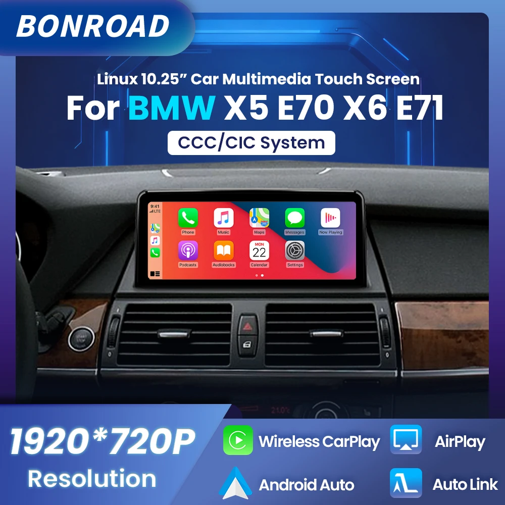 BONROAD Linux 10,25 Zoll Wireless CarPlay Multimedia-Player Autoradio Android Auto für BMW X5 E70 X6 E71 CCC/CIC Touchscreen Navi