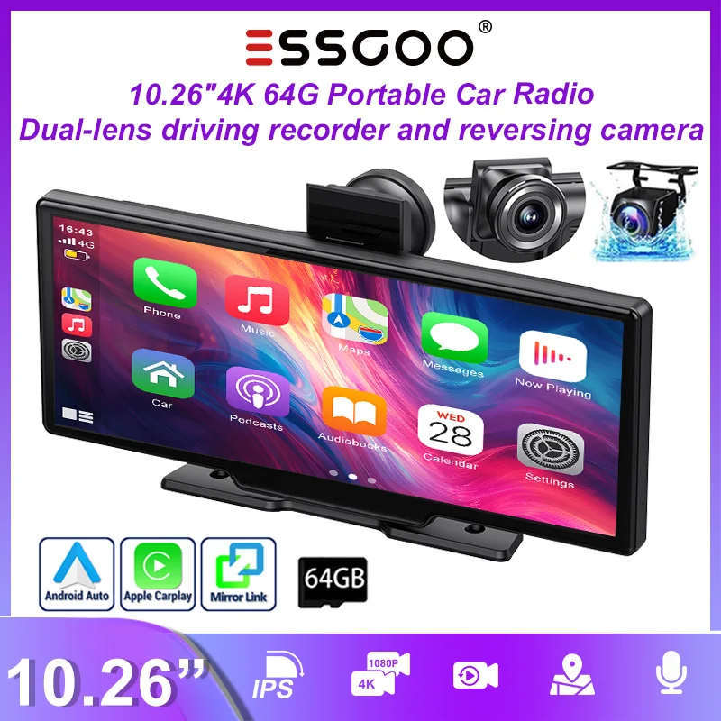 Tragbares Autoradio ESSGOO 10.26" 4K 64 GB TF Touchscreen CarPlay Bluetooth Android Auto Karte Doppellinsen-Dashcam Rückfahrkamera WiFi AUX FM Lenkradsteuerung Mirror Link