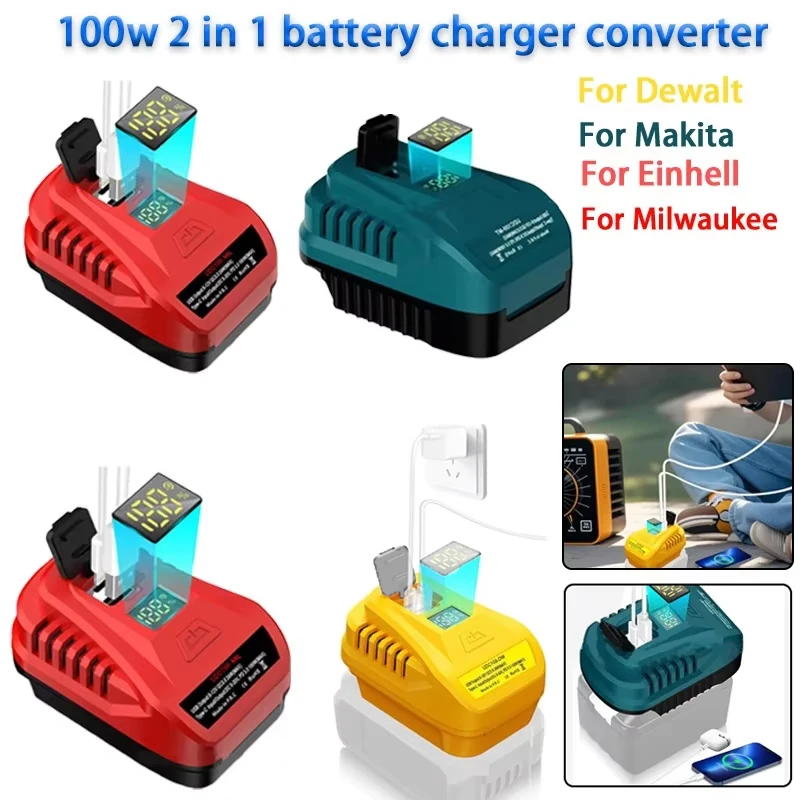 100 W USB-Wandladegerät-Set, Adapter für Makita/Dewalt/Milwaukee/Einhell 18 V Li-Ionen-Akku-Konverter QC3.0 Typ C mit LED-Anzeige
