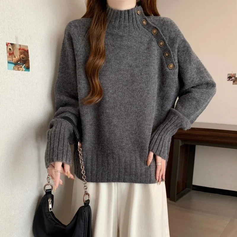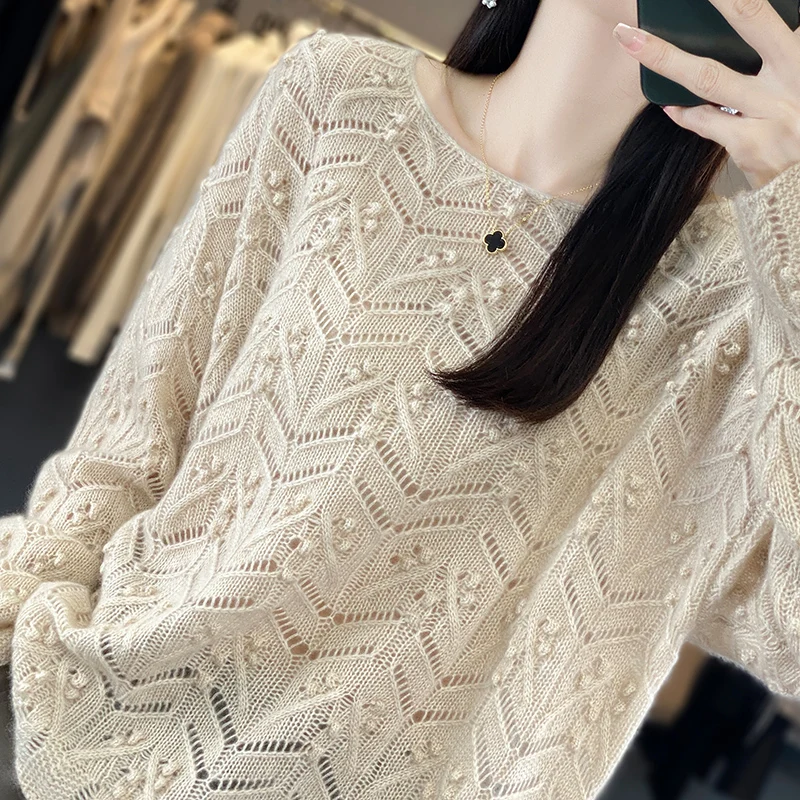 Damen-Pullover aus reiner Wolle mit Lochmuster, lockerer Strickpullover, langärmlig, mit Rundhalsausschnitt und Spitzendetails, Frühlings- und Herbstmode