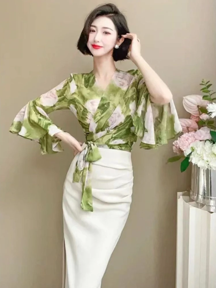 Trendige Bluse mit ausgestellten Ärmeln für Damen, Farbblock-Blumenmuster, elegantes, kurzes, schmal geschnittenes Oberteil