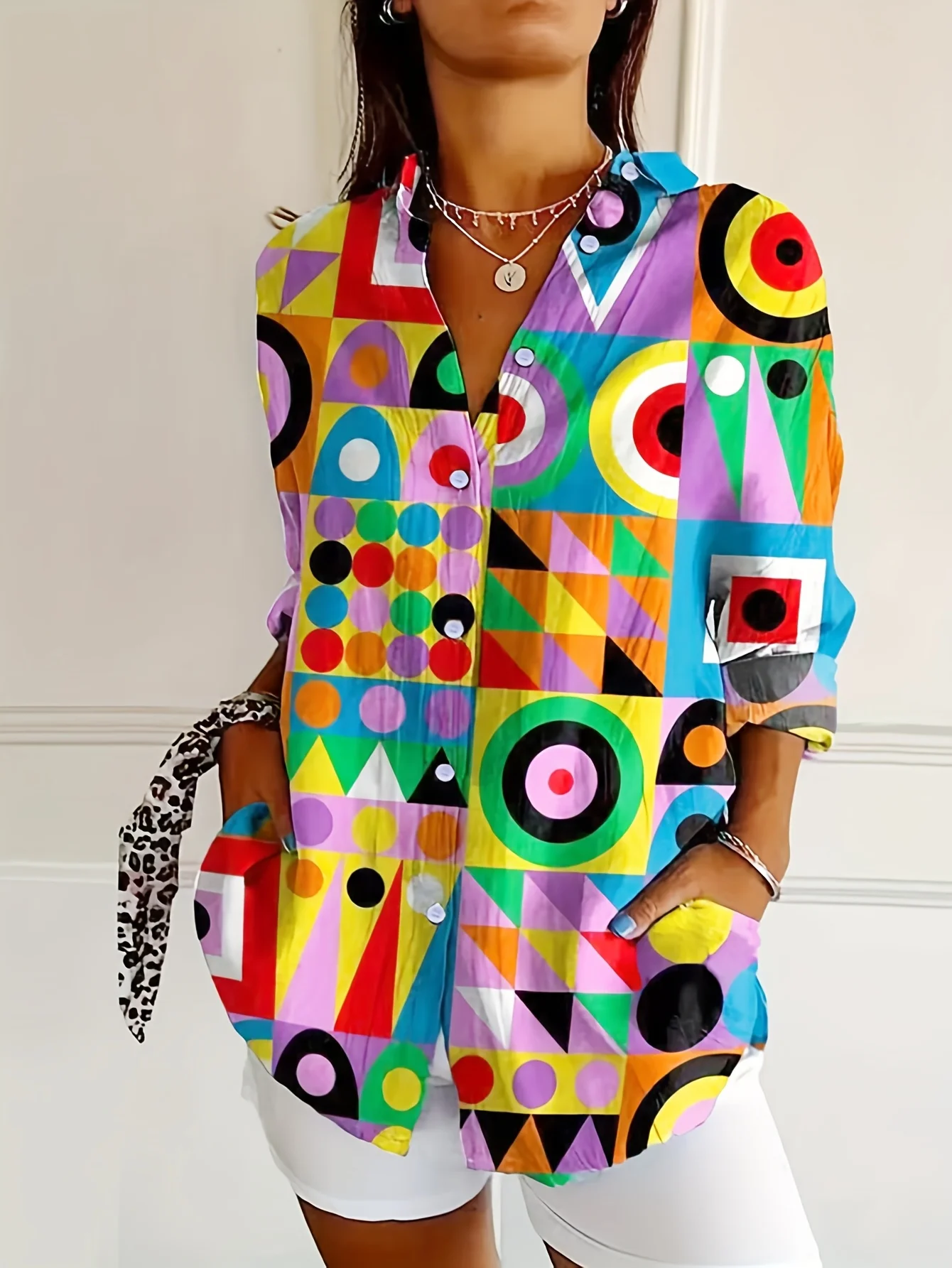 Damen-Hemd mit Dopamin-Geometrie-Print, langärmelig, Knopfleiste, lebendiges Farbblock-Design, modische Frühlings- und Sommeroberteile