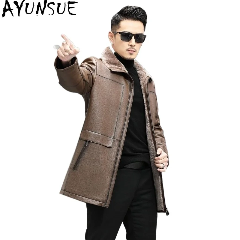 AYUNSUE100 % natürliche Rindsleder-Jacke aus echtem Leder für Herren, Winterjacke mit warmem Wollfutter, mittellanger Echtpelzmantel, Herren-Trenchcoats