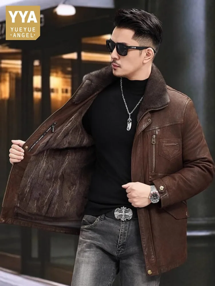 Luxus Echtpelz Männer Jacke Natürliche Ziegenleder Nerz Pelz Futter Oberbekleidung Herbst Winter Bankett Mantel Zipper Echtes Leder Mantel