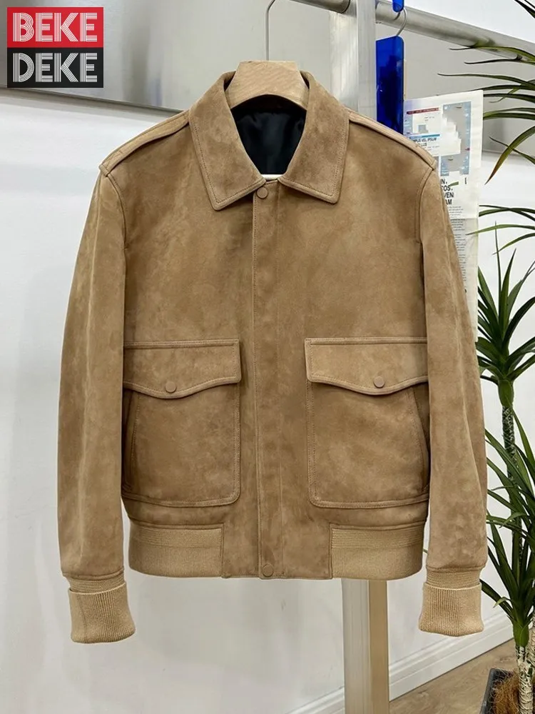 Herren Loose Fit Echtleder Wildleder Reißverschluss-Jacke Wollfutter Mantel Retro Winter Warme Schafsleder-Jacken Umlegekragen Oberbekleidung