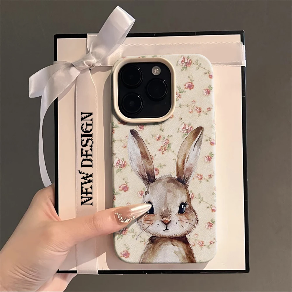 Hasen- & Blumenmuster-Design für iPhone 17 Air 16 15 14 13 12 11 Pro Max Plus X, Premium Litchi-Leder, Niedliche Schutzhülle.