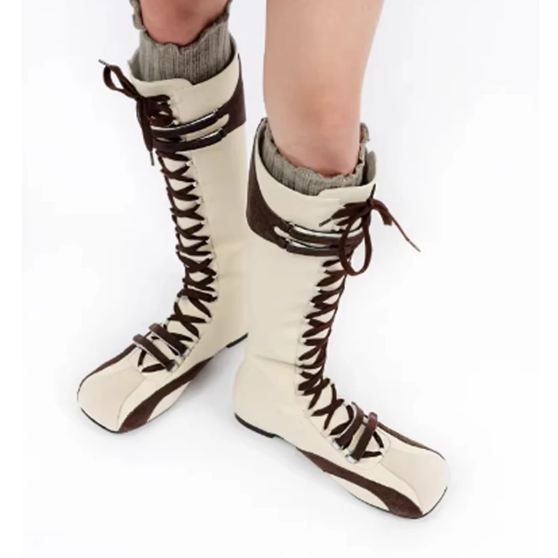 Quadratische Spitze Schnürung Reißverschluss Hinten Kniehohe Ritterstiefel Damen Winter 2026 Vordere Schnürung Sportstiefel Cosplay-Schuhe Modische Fußbekleidung