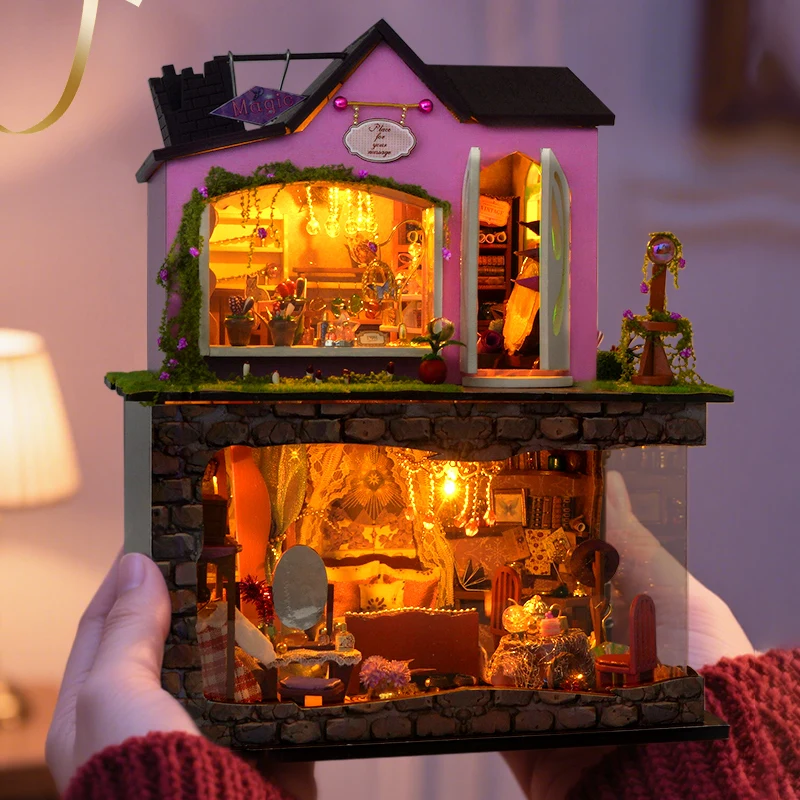 DIY Holz Hexe Zauberladen Casa Figuren Miniaturen mit Licht montiert Villa für Freunde Geburtstagsgeschenke Home Decor Handwerk