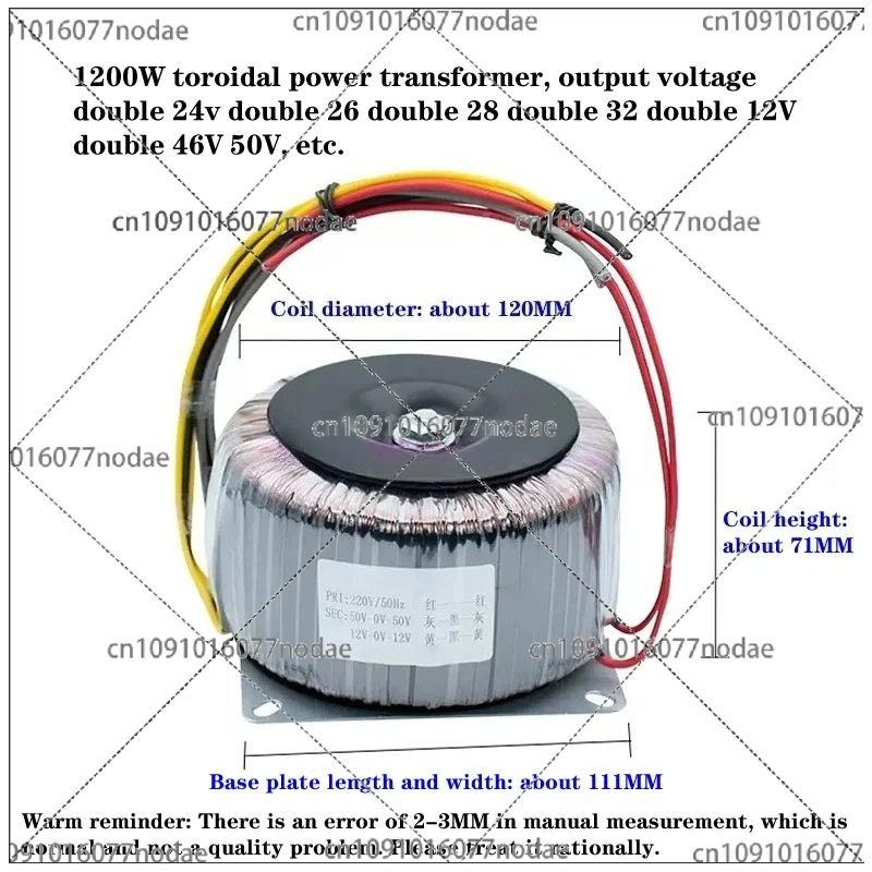 1200 W Ringkern-Leistungstransformator, Ausgangsspannung, doppelt 24 V, 26, 28, 32, 12 V, 46 V, 50 V usw.