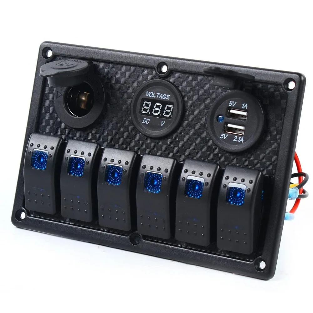 Digitales Voltmeter-Aluminium-Panel, zwei USB-Anschlüsse, 6-faches Wippschalter-Panel, DC 12 V/24 V, Auto, Marine, Boot, Stromschaltung, LED-Leistungsschalter