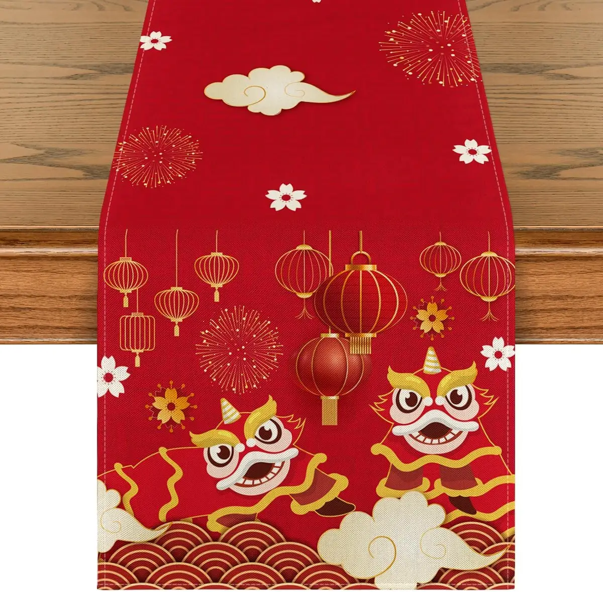 Chinese Lunar New Year Red Latern Lion Linen Table Runner Party Decor Spring Festival Kitchen Dining Table Runner New Year Decor