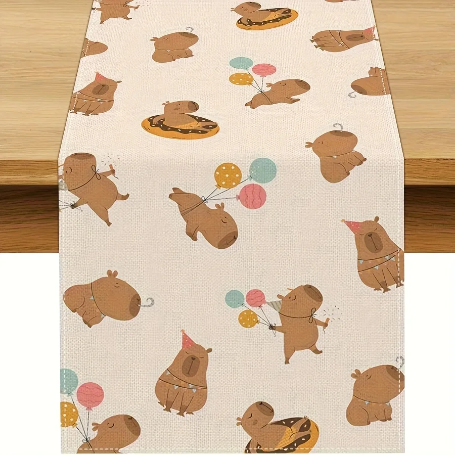 Capybara Birthday Table runner | Balloons Confetti Pastel Striped Easy-Clean Rectangular Teen Girl Boy Party Decor