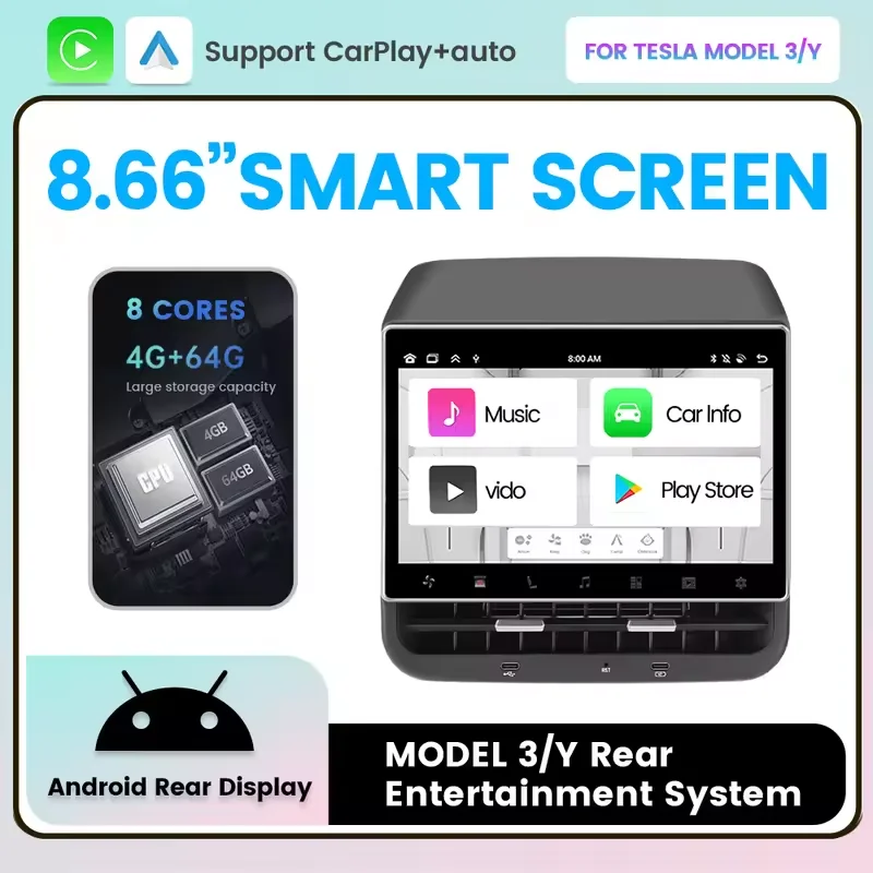 8.66” For Tesla Model 3/Y Rear Entertainment & Climate Control 4G+WIFI Display Android 13.0 Tesla Model Y 2025 Car Accessories