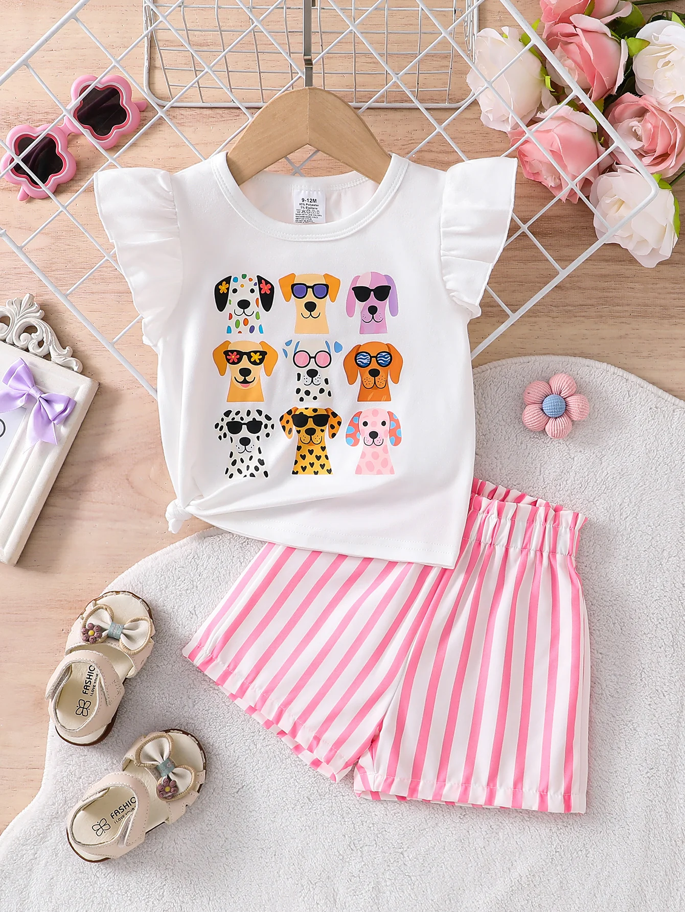 2-Piece Set for Baby Girls: Summer Thin Sleeveless Shorts Outfit, Animal Cartoon Print Round Neck Flutter Sleeve Pullover Top + Striped Elastic Waist Pants Set. Cute, Fashionable, Sweet, Versatile Two-Piece Set for Girls. Newborn Birthday Gift. Comfortable and Soft. Suitable for Ages 0-1-2-3, 6-9 Months. Perfect for Outdoor Activities, Casual Wear, Parties, Holidays, Eid, Easter, Celebrations
