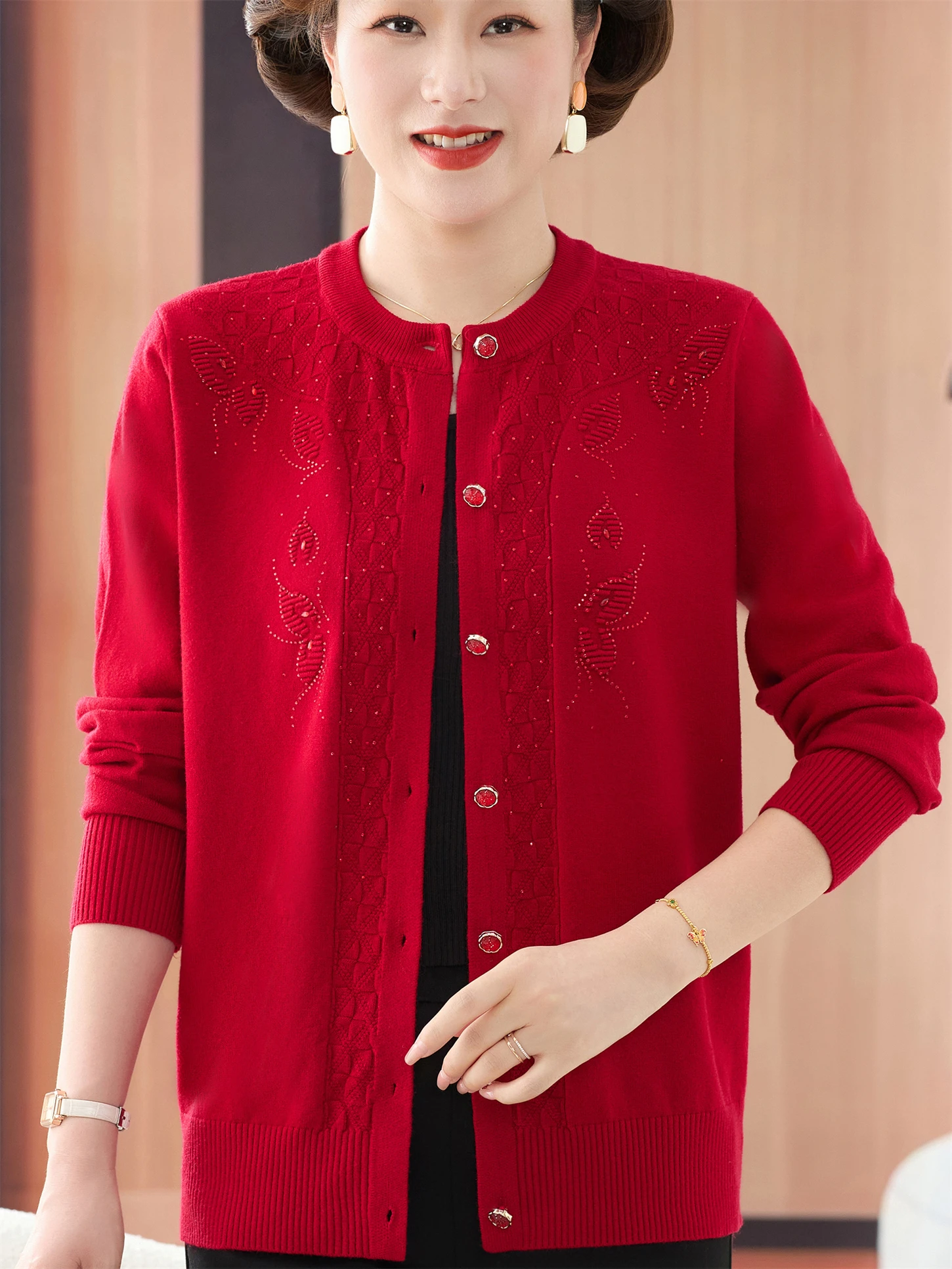 Sli round Ne Embroidered Knitwear Top Button up mid Aged And ly Faionable Mommy Clothes Autumn Sweater Coat