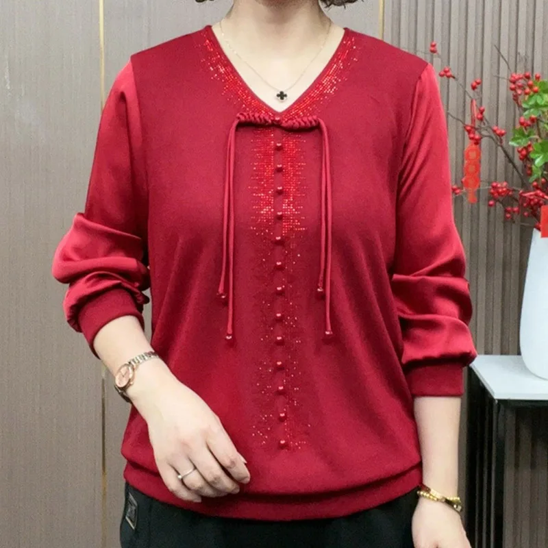 Spring New Sle Slimming Long Sve Casual Loose Mom Clothes Faionable Ladies Top V-Ne Commute Sle Polyester Fiber