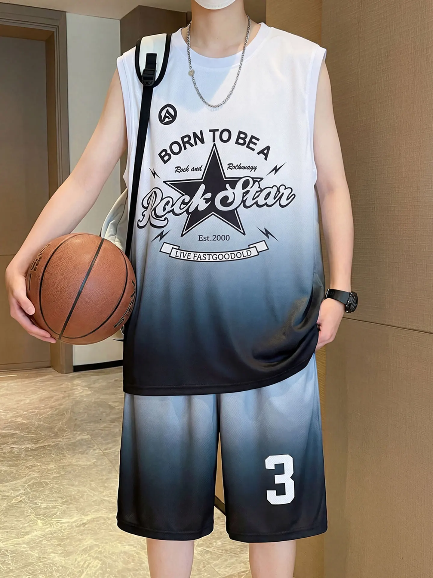 American Gradient Basketball Uniform Set Men's Summer Quick Dry Breathable Loose Sports Vest Shorts Two Piece Set Trendy