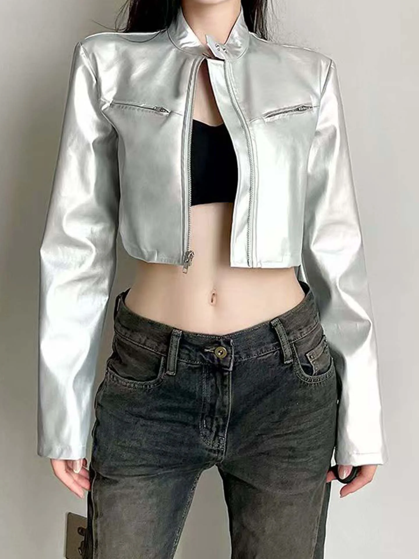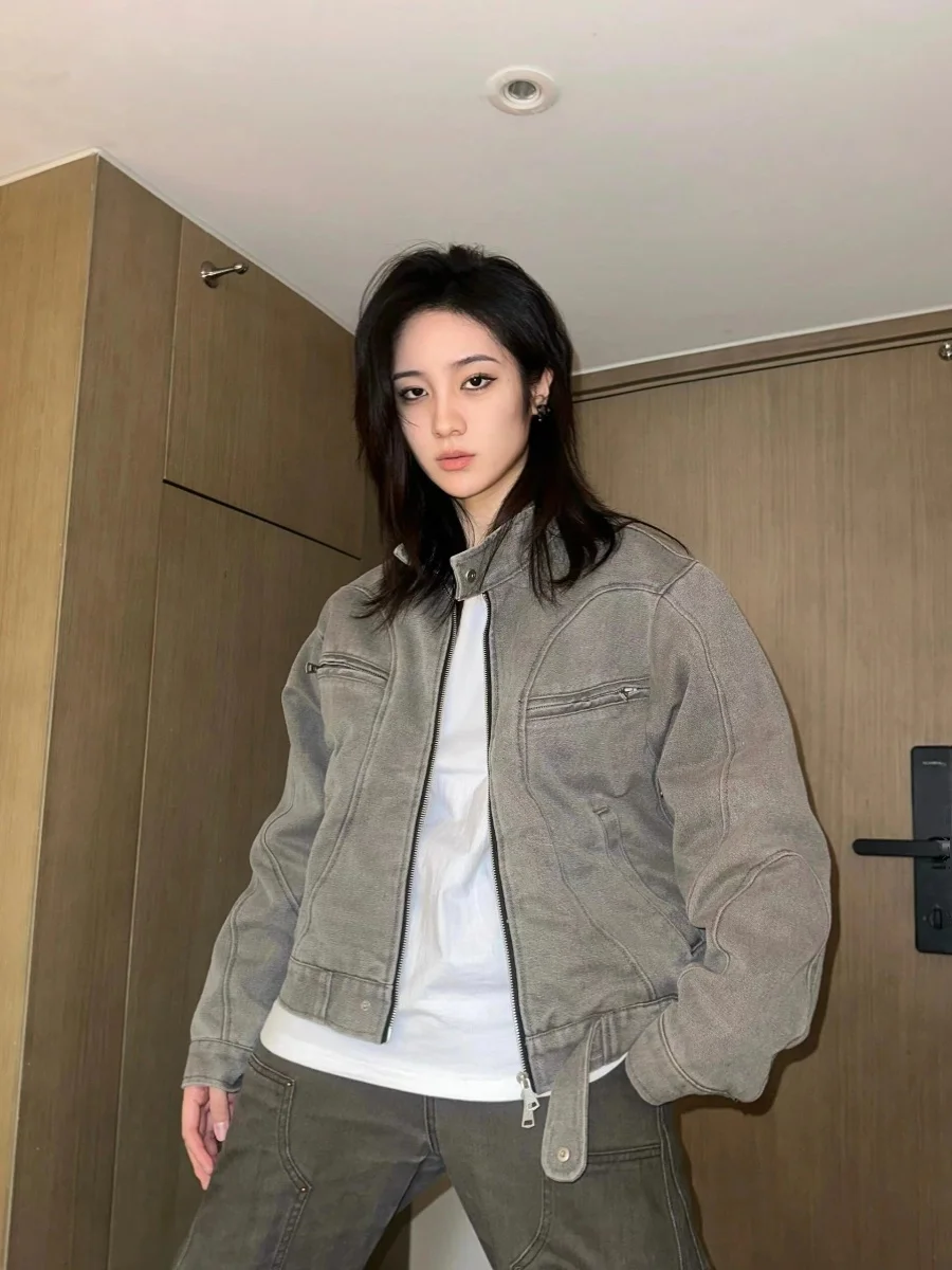 American Sle ort Zipper Stand Collar Jaet Women's Personali Design Workwear Sexy Girl ort Top Coat
