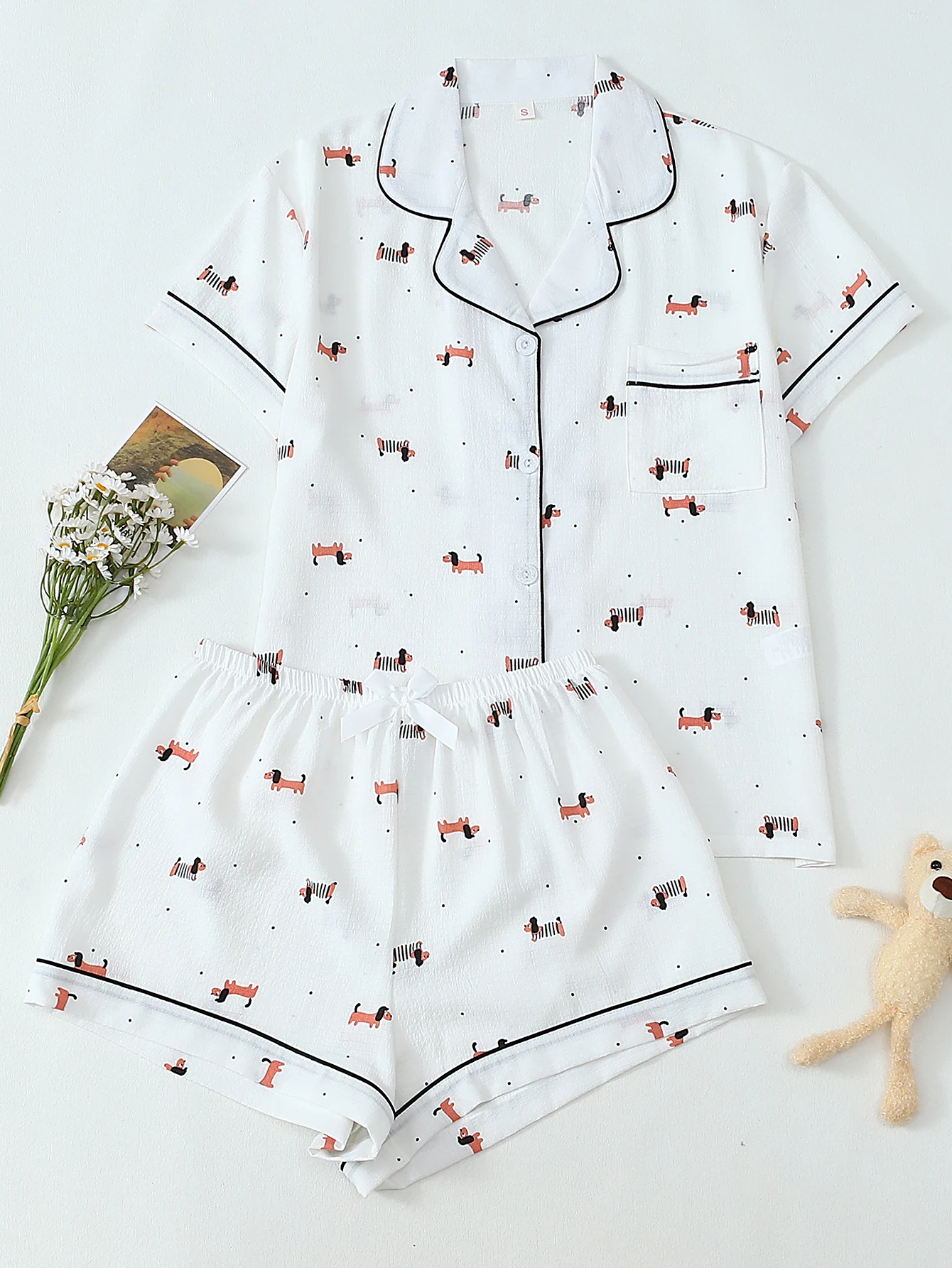 Two-Piece Comfortable Mini Dog Print Lapel Button Short-Sleeve Top with Pockets and Bow Shorts Spring/Summer Women's Pajamas Loungewear Set Suitable for Home Use