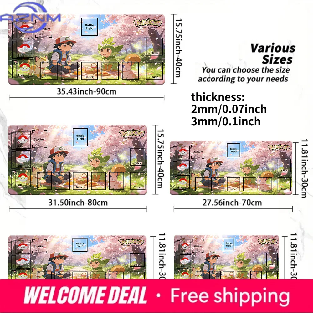Pokemon Ash Chespin Cherry Blossom Picnic TCG Playmat, Anime Trading Card Game Mat with Zones, 2mm/3mm Thick Non-Slip Mouse Pad