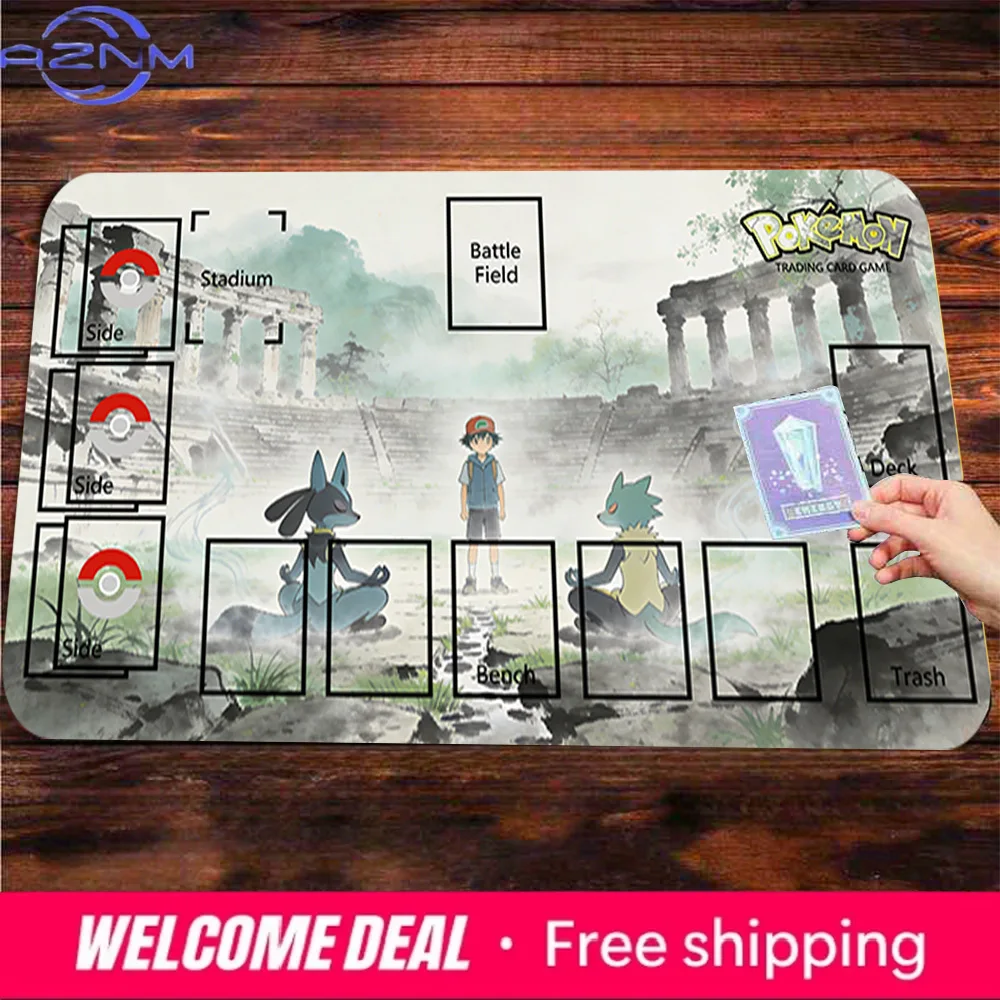 Pokemon Ash Lucario Ancient Ruins TCG Playmat, Anime Trading Card Game Mat with Zones, 2mm/3mm Thick Non-Slip Mouse Pad for CCG