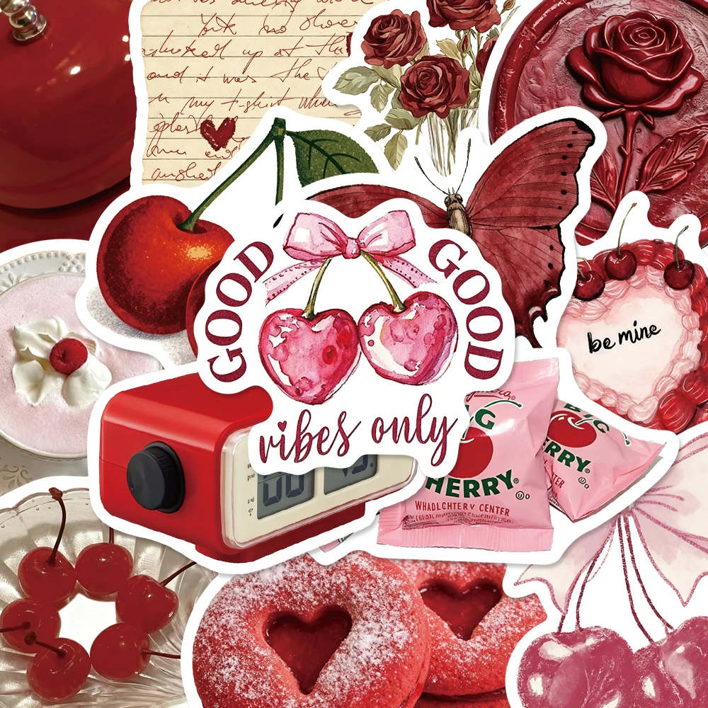 50pcs Aesthetics Cherry Coloured Women Sticker Red Cartoon Gift Decal DIY Scrapbook Laptop Luggage Stationery Decorative Sticker