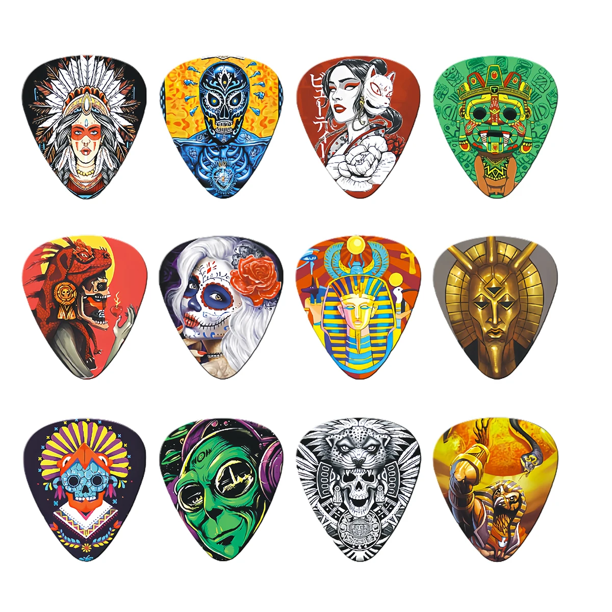 12PCS Unique Colorful Printed ABS Guitar Picks Set with Metal Box Durable Plectrums for Electric & Bass Guitar Accessories Gift