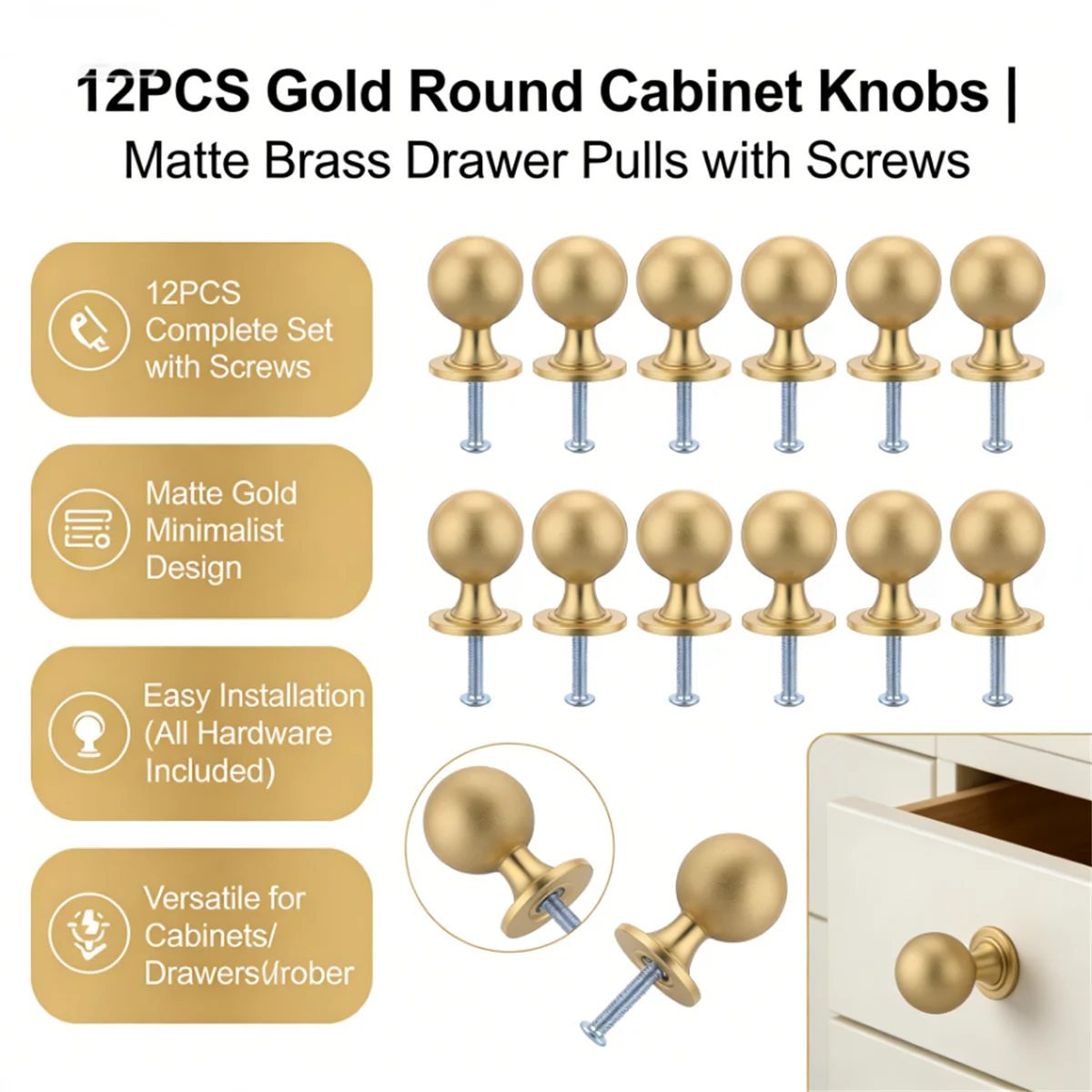 12Pcs Gold Round Ball Cabinet Knobs Brushed Brass Drawer Pulls with Mounting Screws Modern Cabinet Handles for Dresser Wardrobe