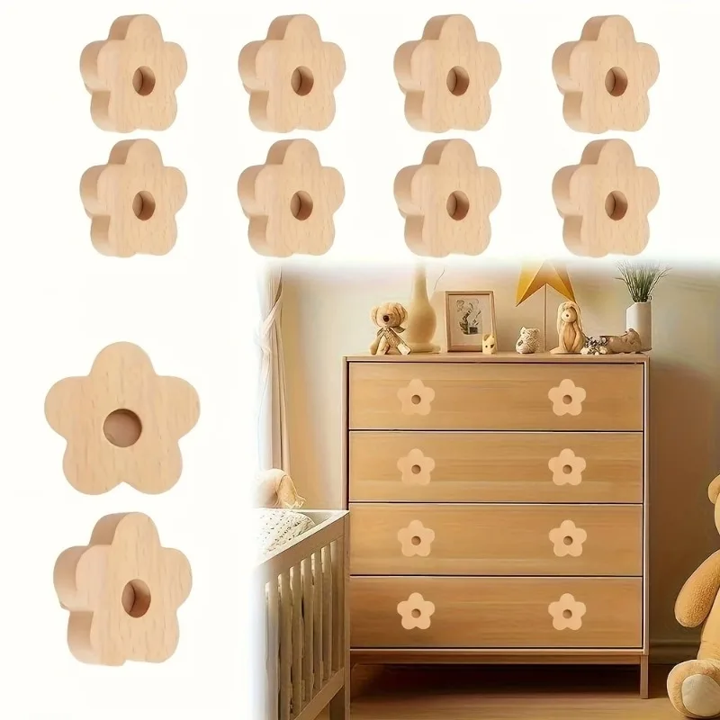 12pcs Wooden Flower Knob Pull Handles Solid Wood Drawer Cabinet Grips with Mounting Screws Furniture Wardrobe Decorative Handles
