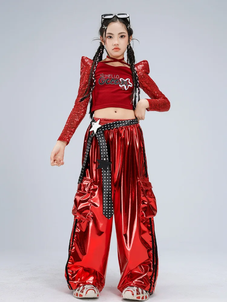 Girls' Jazz Dance Performance Outfit Red Sequin High oulder Belly Bearing Set Children's Faion ow Costume Stage Perform