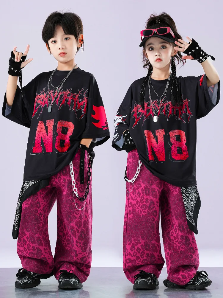 Kid Kpop Hip Hop Clothing Black Letters T Shirt Pink Leopard Print Casual Baggy Pants for Girl Boy Jazz Dance Costumes Clothes
