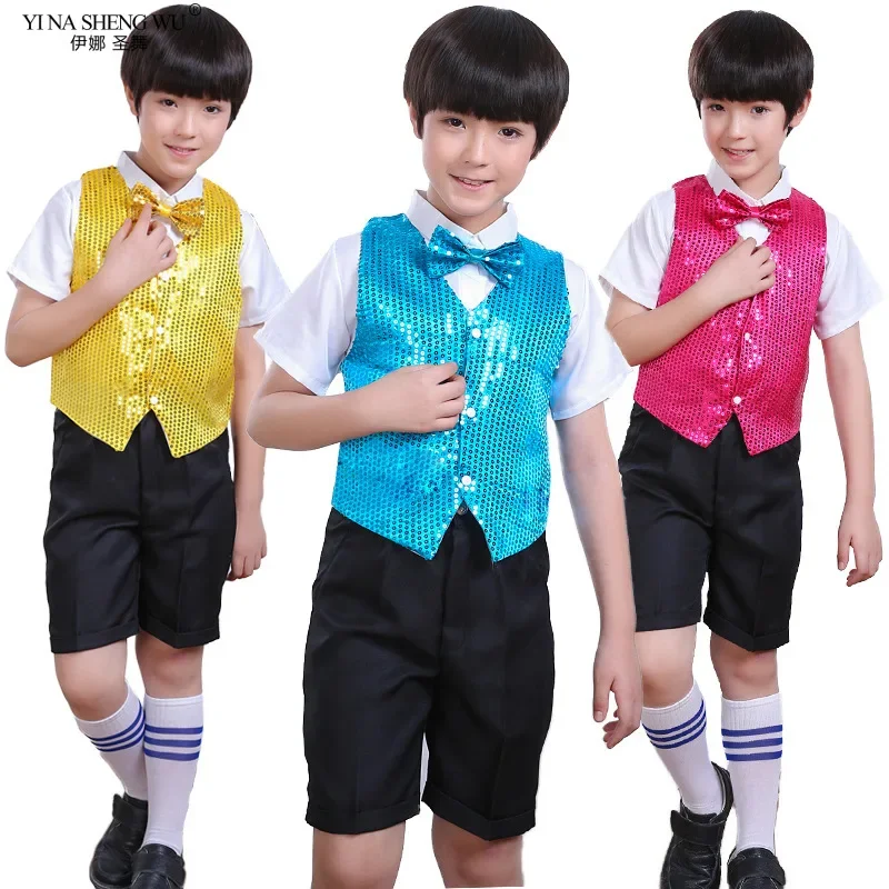 New Jazz Dance Costume Boys Girls Sequined Vest Children Dancewear Performance Waistcoat Modern Dancing Clothes Sleeveless Vest
