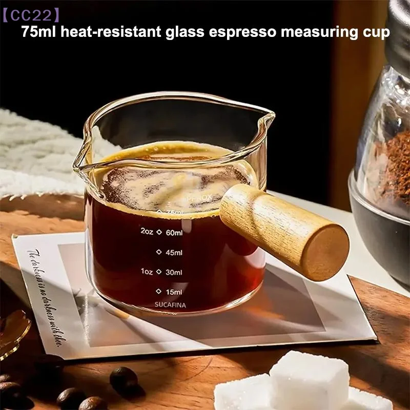 【CC22】75ml Heat-resisting Glass Espresso Measuring Cup Double Mouth Milk Jug With Wood Handle Scale Measure Mugs{C}