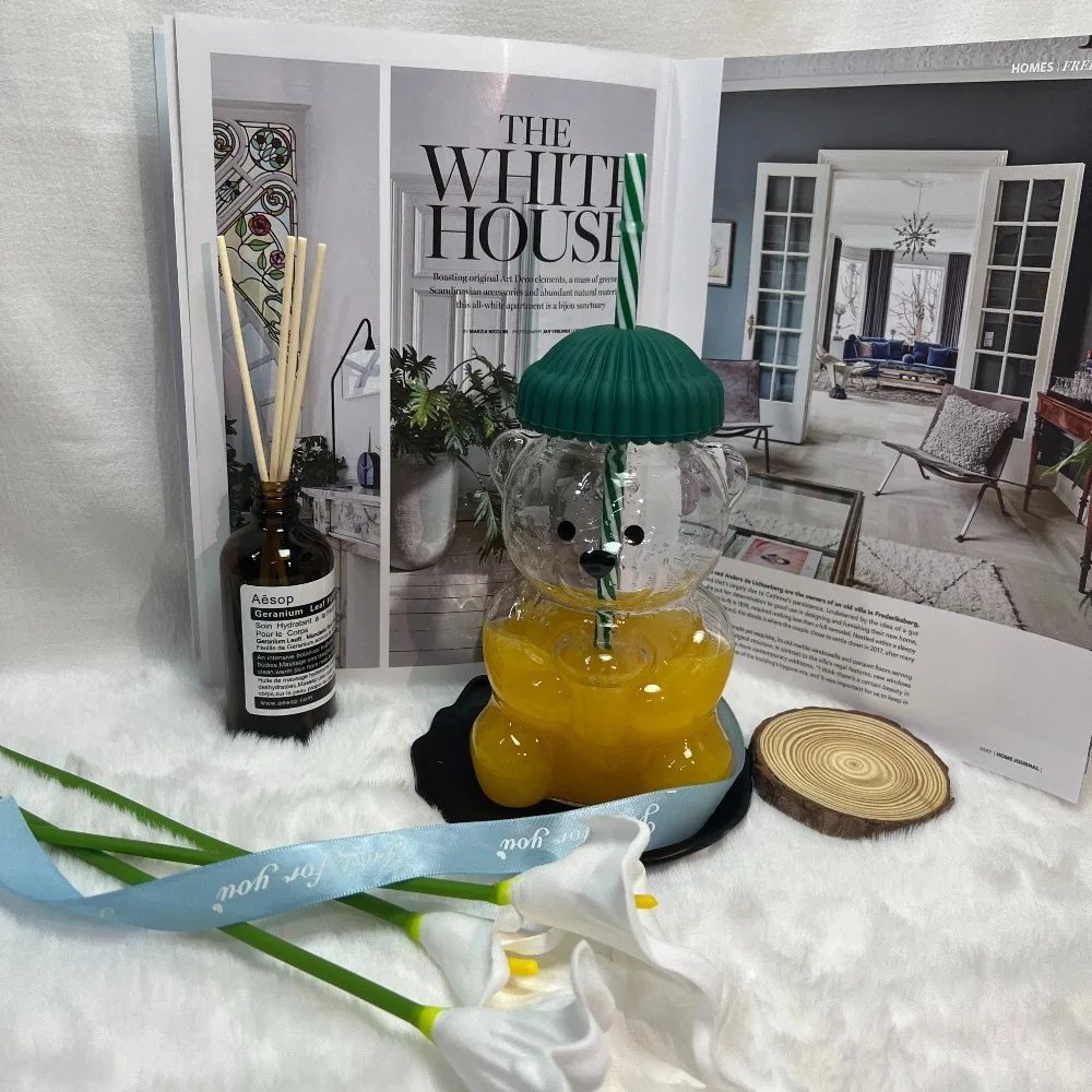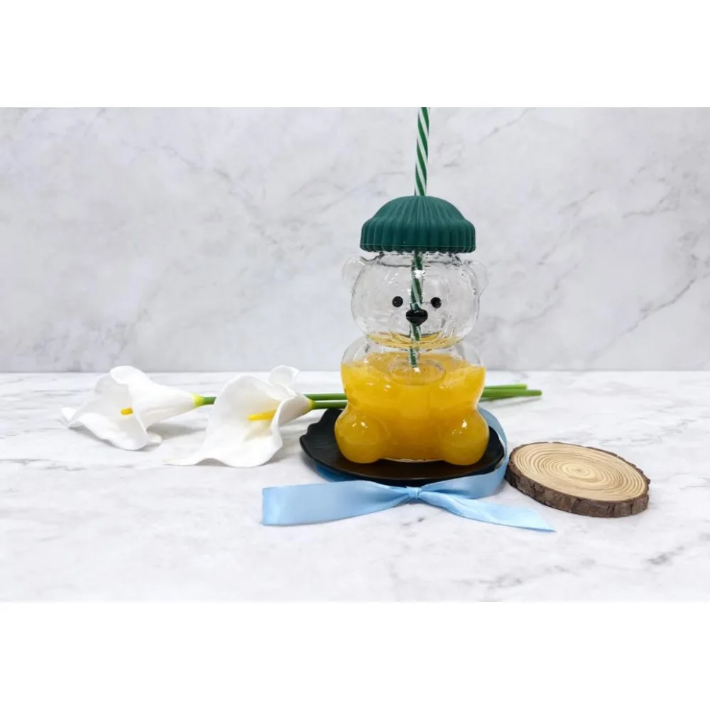 2025 New Bear Straw Cup Bear shaped Glass Cup, equipped with a straw, can hold juice, milk tea, and coffee for family gatherings