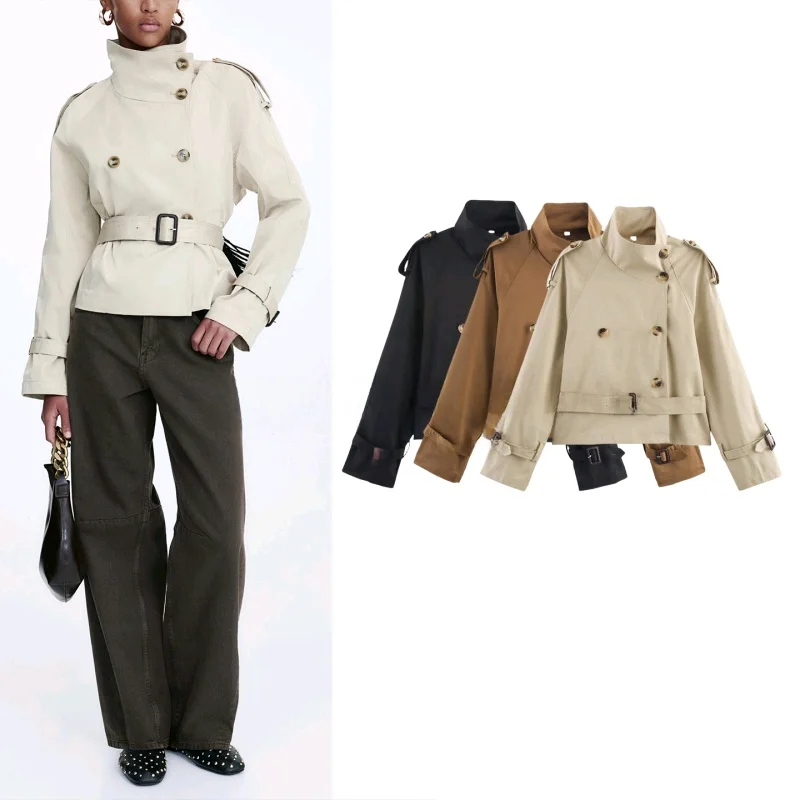 Women Lapel V-neck Trench Coat 2026 Fashion Lace Up Belted Long Sleeve Button Slim Short Windbreaker Casual Streetwear Outerwear
